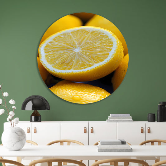 Close-up van een sappige citroen met waterdruppels aluminium muurcirkel