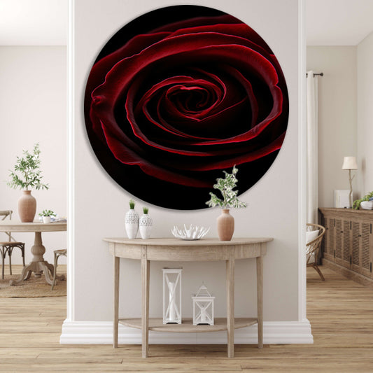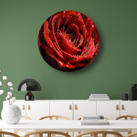Close-up van een rode roos met dauwdruppels aluminium muurcirkel