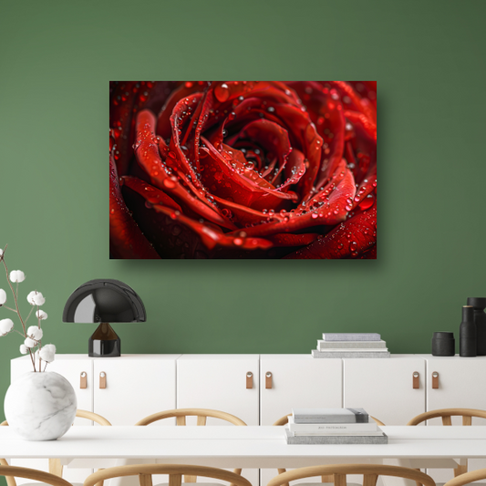 Close-up van een rode roos met dauwdruppels canvas met baklijst
