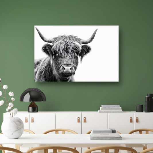 Close-up van een Schotse Hooglander in zwart-wit canvas met baklijst