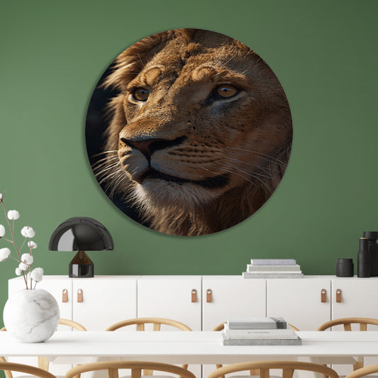 Close-up van leeuw met indringende blik aluminium muurcirkel