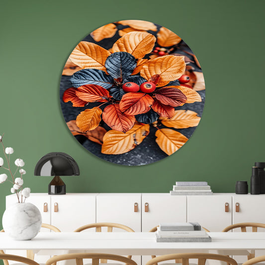 Close-up van rode bessen en herfstbladeren. aluminium muurcirkel