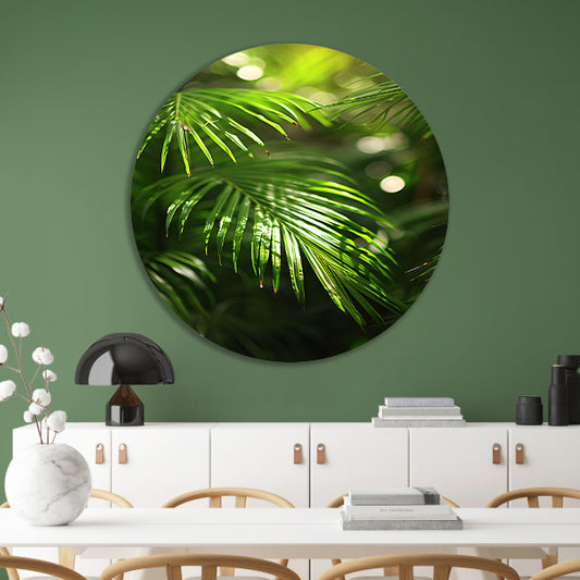 Close-up van zonovergoten palmbladeren aluminium muurcirkel