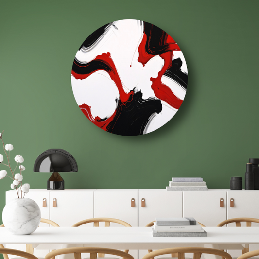 Contrastrijke abstractie in rood en zwart aluminium muurcirkel