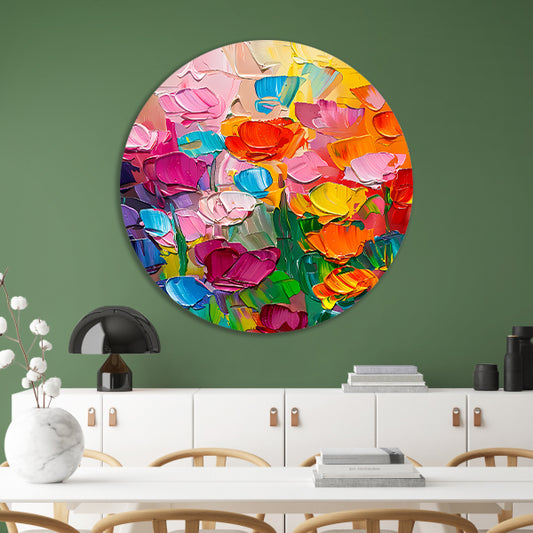 Abstract kleurrijk bloemenveld schilderij voor interieur aluminium muurcirkel