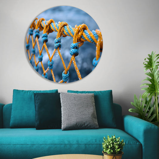 Abstract Knoop in Blauw en Geel aluminium muurcirkel