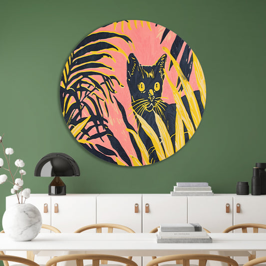 Kat tussen kleurrijke planten in popartstijl aluminium muurcirkel