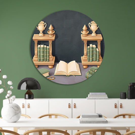 Klassiek stilleven met boeken en trofeeën aluminium muurcirkel