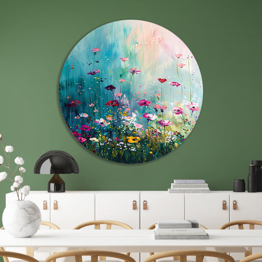 Kleurrijk abstract bloemenveld schilderij aluminium muurcirkel