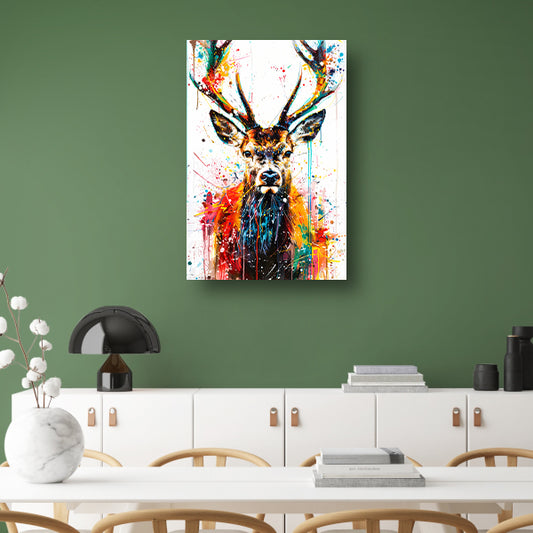 Kleurrijk abstract hert schilderij met spetters canvas met baklijst