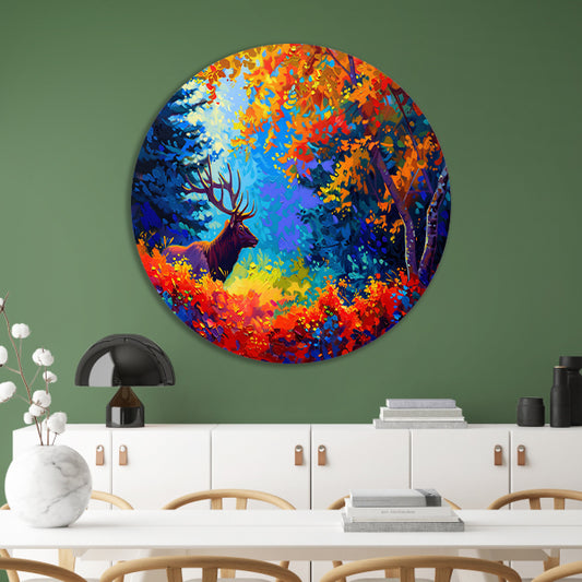 Kleurrijk abstract hert in bos aluminium muurcirkel