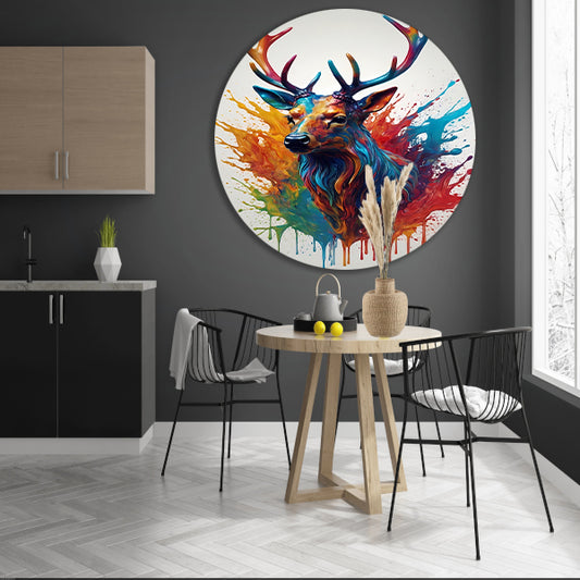 Kleurrijk abstract hert schilderij met spetters forex muurcirkel