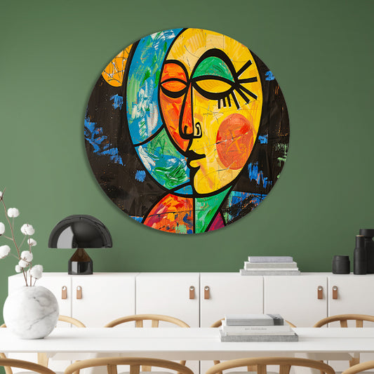 Kleurrijk abstract portret met aardse vormen aluminium muurcirkel