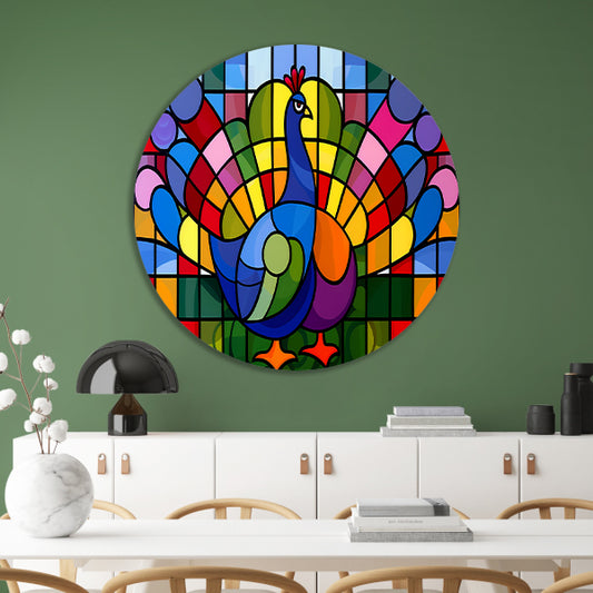 Kleurrijk abstract pauwen schilderij op glas forex muurcirkel