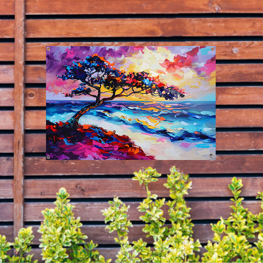 Kleurrijk abstract schilderij van boom en zee tuinposter