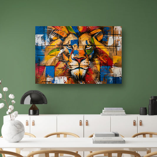 Kleurrijk abstract schilderij van een leeuw canvas met baklijst