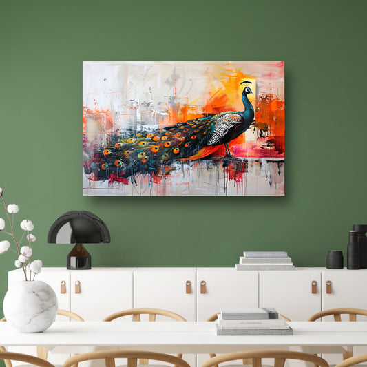Kleurrijk abstract schilderij van een pauw canvas met baklijst