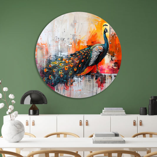 Kleurrijk abstract schilderij van een pauw aluminium muurcirkel