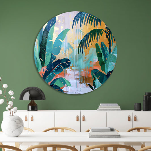 Kleurrijk abstract schilderij van een regenwoud aluminium muurcirkel
