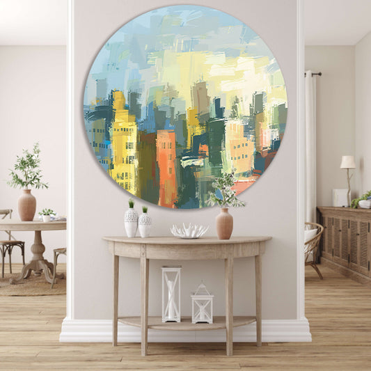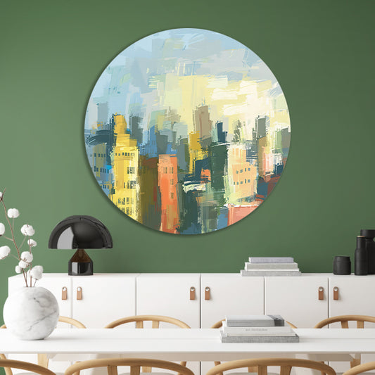 Kleurrijk abstracte skyline schilderij op doek aluminium muurcirkel