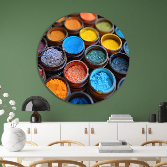Kleurpotloden op houten achtergrond aluminium muurcirkel