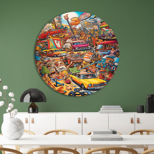 Abstracte auto in kleurrijk landschap aluminium muurcirkel