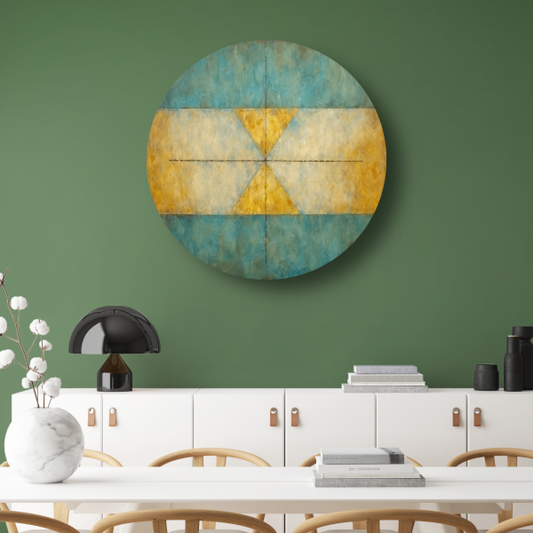 Geometrische compositie in geel, blauw en wit aluminium muurcirkel