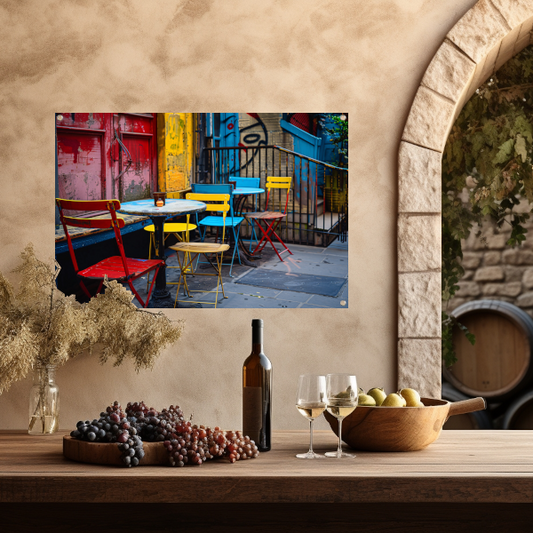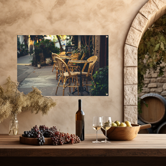 Rustiek Terras met Bistrostoelen bij Schemer tuinposter