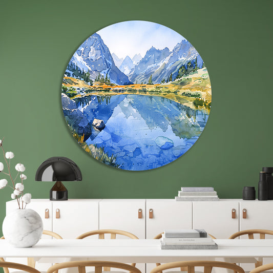 Serene Bergmeren met Reflecties in Aquarel aluminium muurcirkel