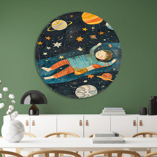 Dromend Jongetje in een Kleurrijk Heelal aluminium muurcirkel