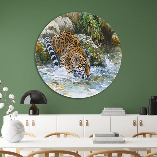 Realistische aquarel van een jaguar in water aluminium muurcirkel
