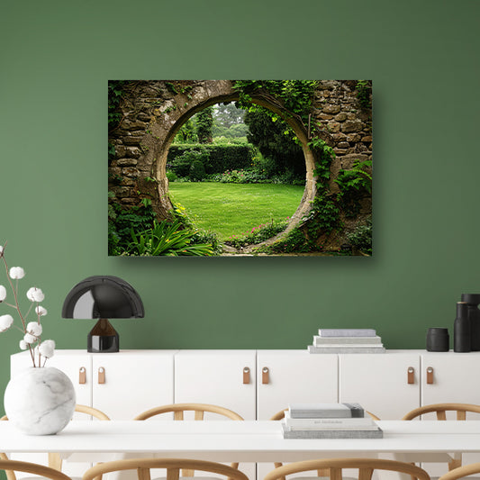 Weelderige tuin gezien door een oude stenen boog canvas met baklijst