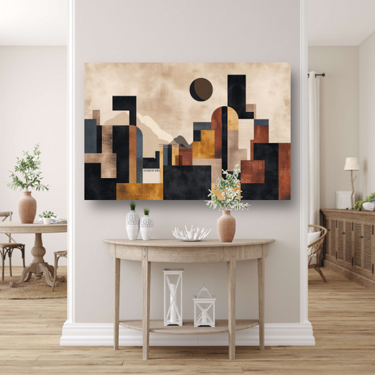 Geometrische Abstracte Skyline in Bruin en Goud canvas met baklijst