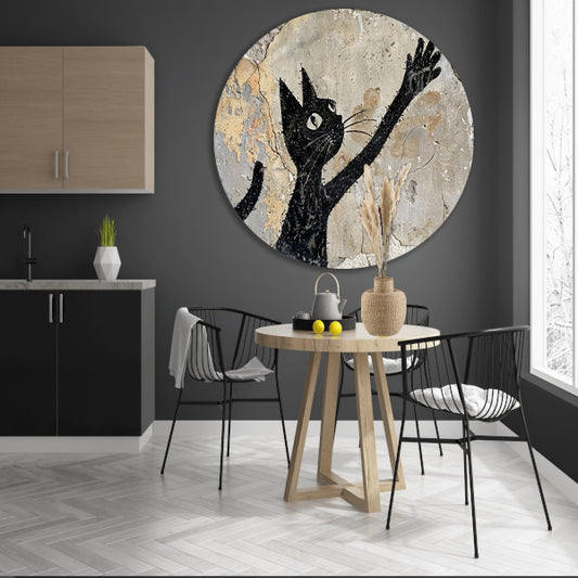 Zwarte kat op verweerde muur reikend omhoog aluminium muurcirkel