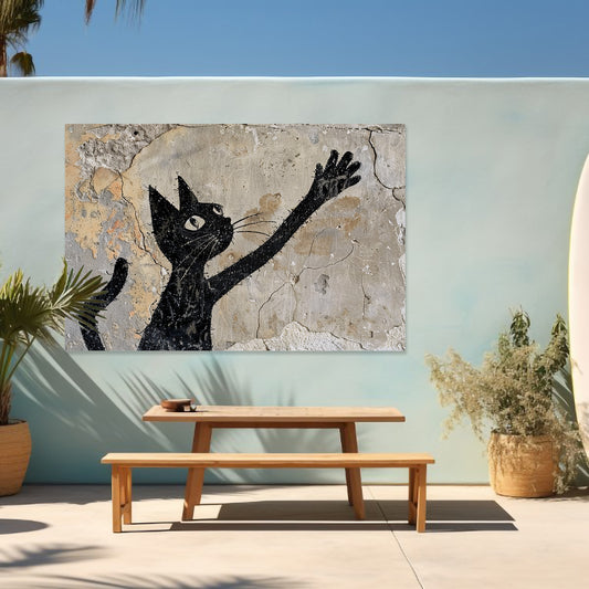Zwarte kat op verweerde muur reikend omhoog tuinposter