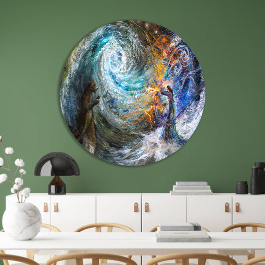 Vrouw met beer in droomlandschap aluminium muurcirkel