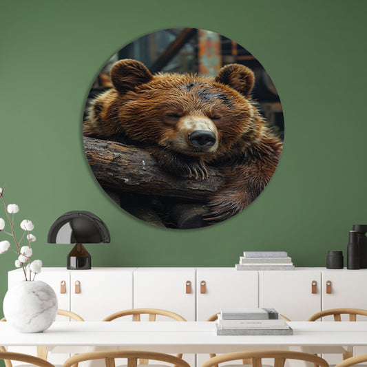 Slapende Bruine Beer op Boomstammen aluminium muurcirkel