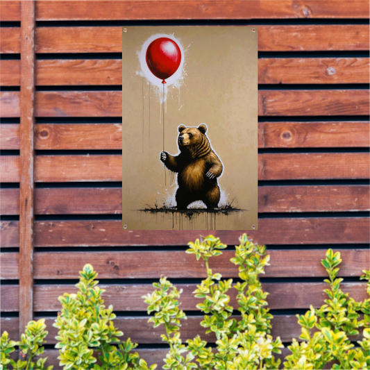 Bruine beer houdt een glanzende rode ballon vast tuinposter