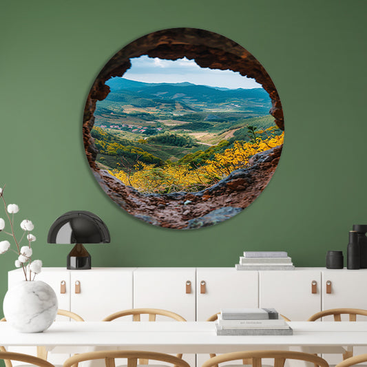 Uitkijk op een Berglandschap door een Stenen Venster aluminium muurcirkel