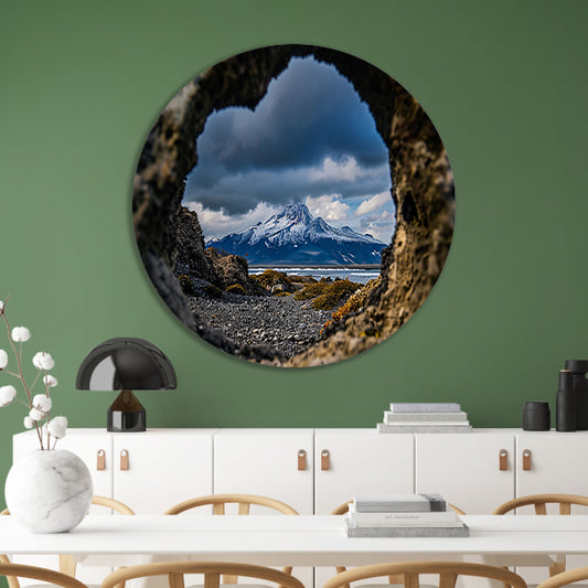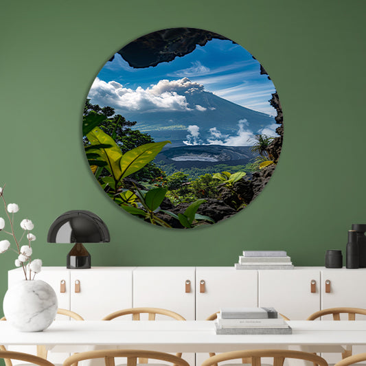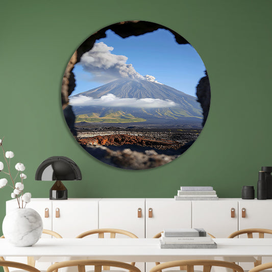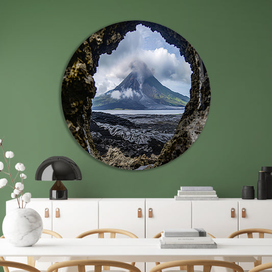 Prachtig uitzicht op vulkaan door rotsopening aluminium muurcirkel