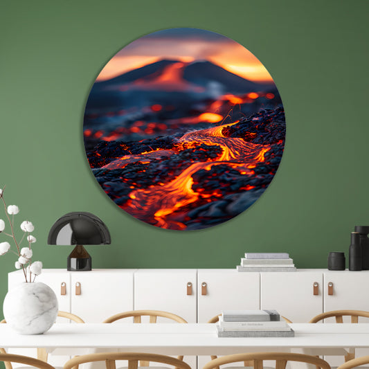 Gloeiende Lavastromen in Vulkanisch Landschap aluminium muurcirkel