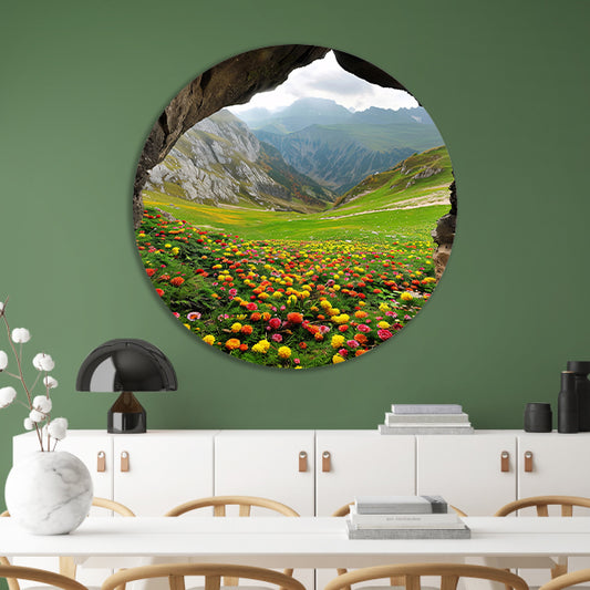 Kleurrijke bloemenzee in berglandschap aluminium muurcirkel