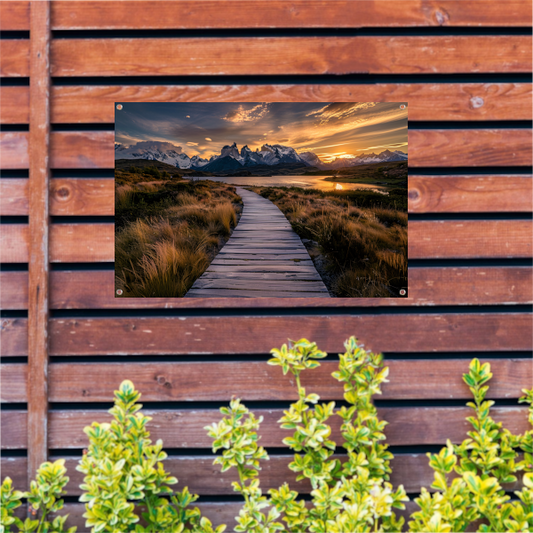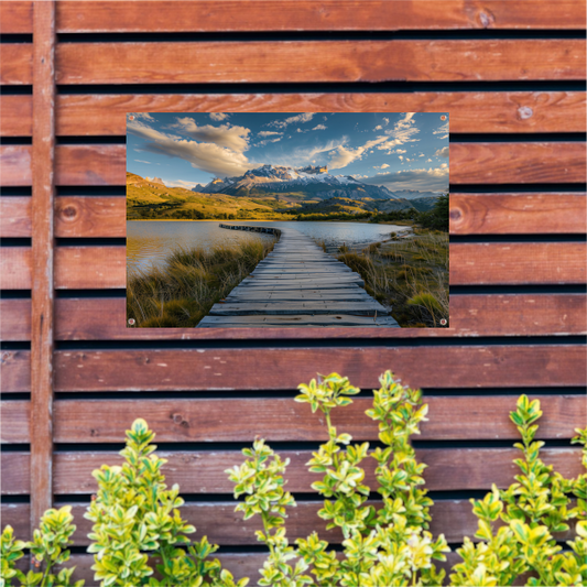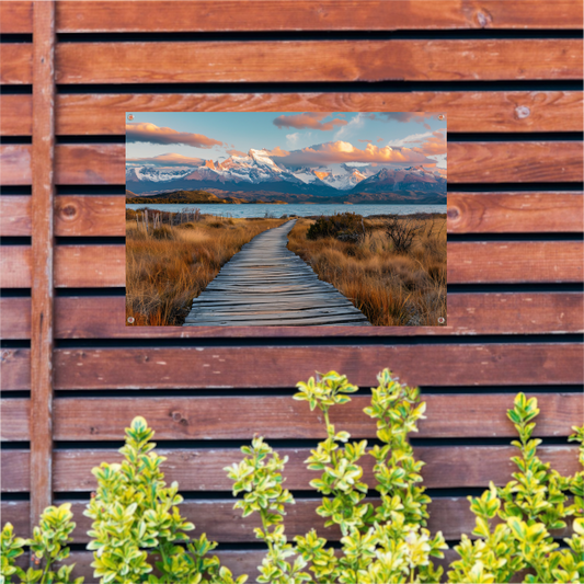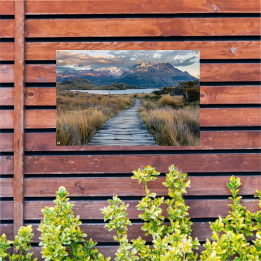 Prachtig Patagonisch landschap met houten pad tuinposter