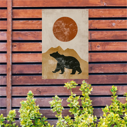 Beer in abstract landschap met geometrische zon tuinposter