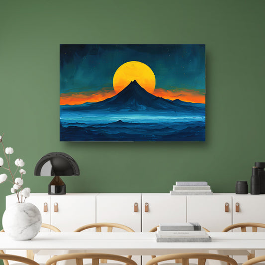 Kleurrijk abstract landschap met bergen en zon canvas met baklijst