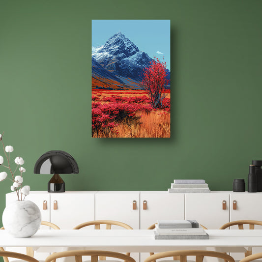 Herfstlandschap met Rode Boom en Sneeuwberg canvas