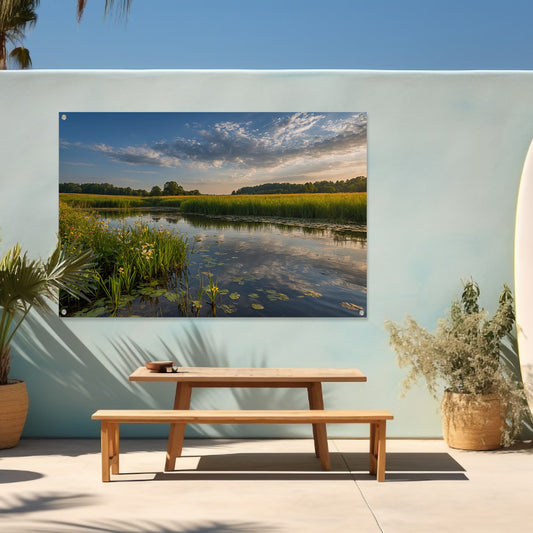 Schilderachtig zomerlandschap met bloemen en water tuinposter