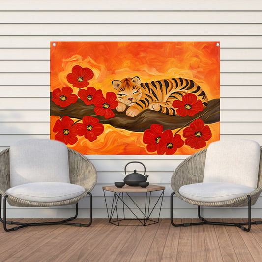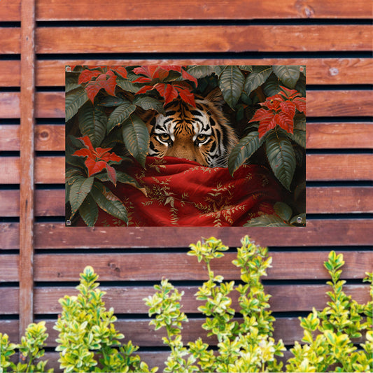 Schilderij van tijger tussen kleurrijke bladeren tuinposter