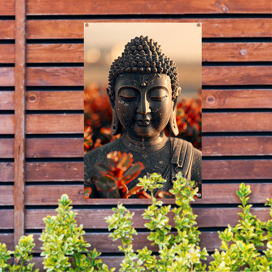 Boeddha tussen bloesems onder gouden licht tuinposter