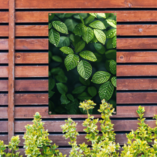 Close-up van groene bladeren met dauwdruppels tuinposter